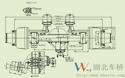 HT24F152-010-5.13主減速器總成噪音低,傳遞扭矩大。其突緣端面至橋殼中心線距離為369mm(見(jiàn)如下安裝尺寸圖)。主從動(dòng)錐齒輪有噪音低、壽命長(zhǎng)的特點(diǎn),其傳遞扭矩24000N.M,裝配成總成后噪音在84dB以下,壽命可達(dá)70萬(wàn)次以上。
