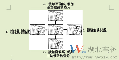 錐齒輪必須有正確的嚙合印痕和嚙合間隙才能正常工作和達到正常的使用壽命。正確的嚙合印痕和間隙是通過齒輪軸向移動改變其相對位置來實現的。因而錐齒輪都有軸向位的調整裝置:(1)主動錐齒輪主要是通過增減軸承座與主減殼之間的調整墊片厚度來調整,調整墊片最多使用3片,以防不平引起漏油,薄片放在中間,如果嚙合印痕偏向齒根部將增加墊片厚度,偏向齒頂部將減少墊片厚度(如下圖);(2)從動錐齒輪的軸向調整裝置是與軸承預緊力的調整裝置是共用的。在預緊力調整好后只要將左右兩側的調整螺母(俗稱花螺母)從一側調整到另一側,或者左右兩側的螺母一側松幾扣另一側等量緊幾扣,就可以在保證軸承預緊力不變的情況下到達嚙合間隙狀況調整的目的,一般這個間隙控制在0.2-0.4之間為宜。如果嚙合印痕偏齒廓的小端則增加齒隙,反之則減小齒隙(如下圖)
