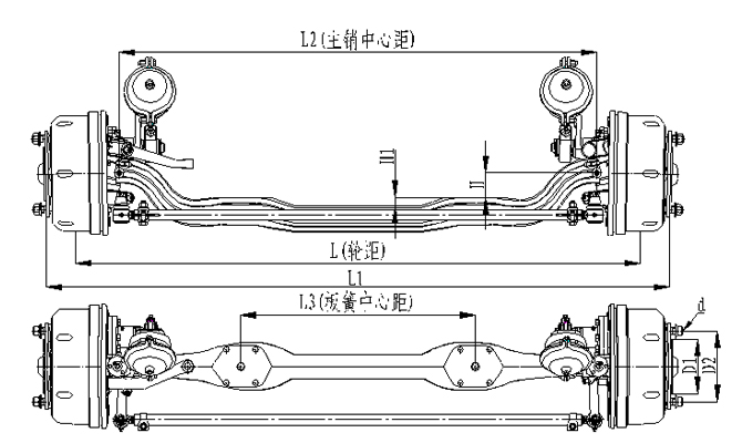 1.前軸為整體鍛造結構,加強設計,承載能力強;2.輪距、板簧距可靈活調整